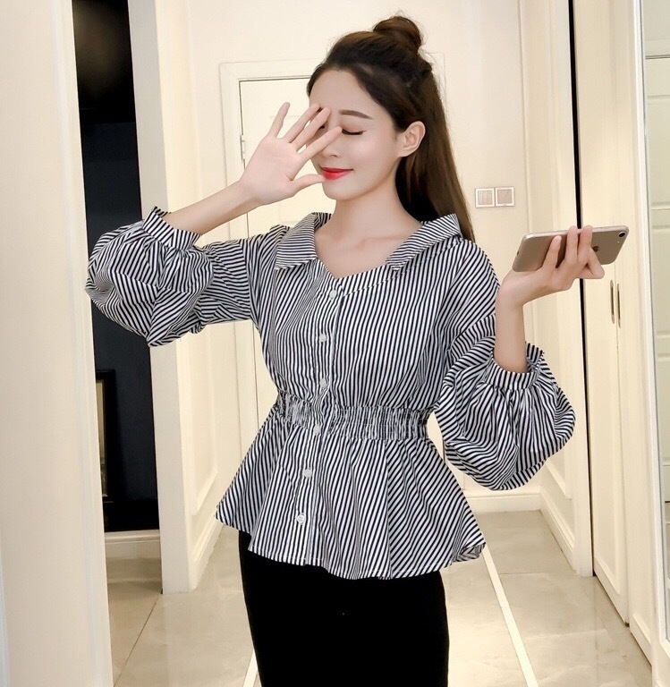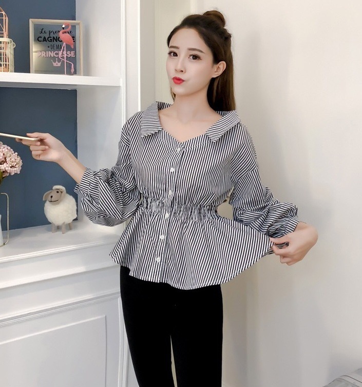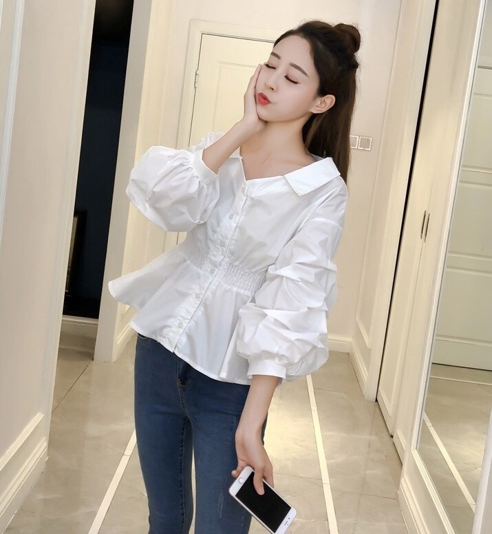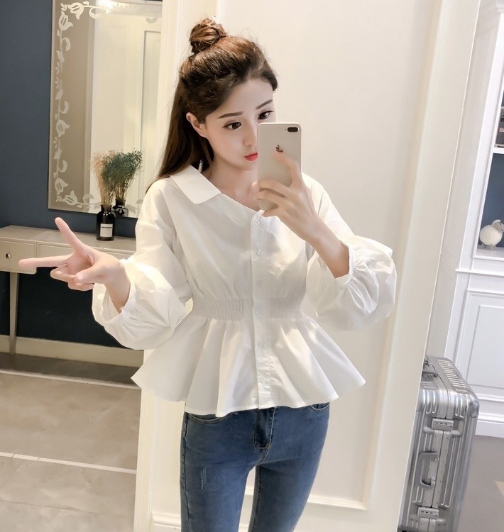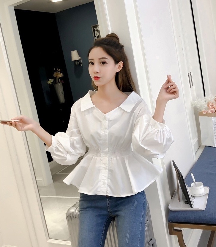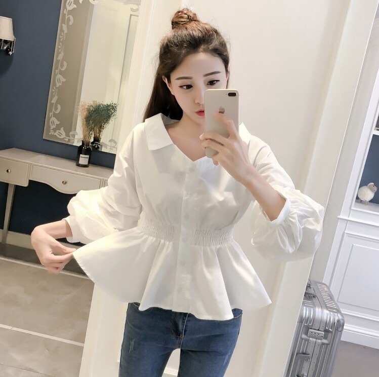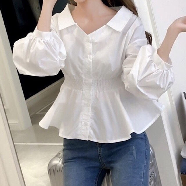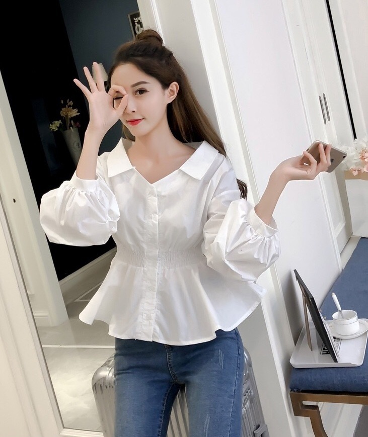 ふんわりとした裾や袖が女性らしく可愛らしい雰囲気の長袖Vネックシャツです。