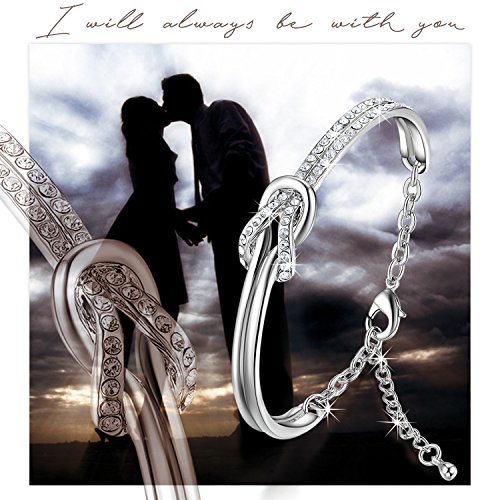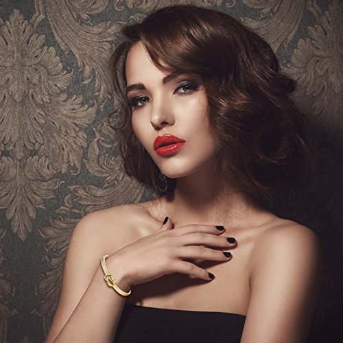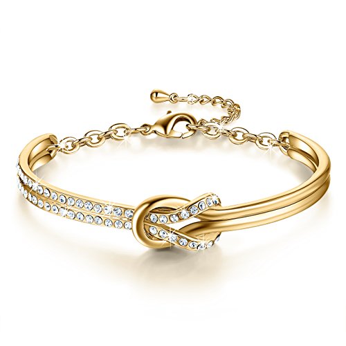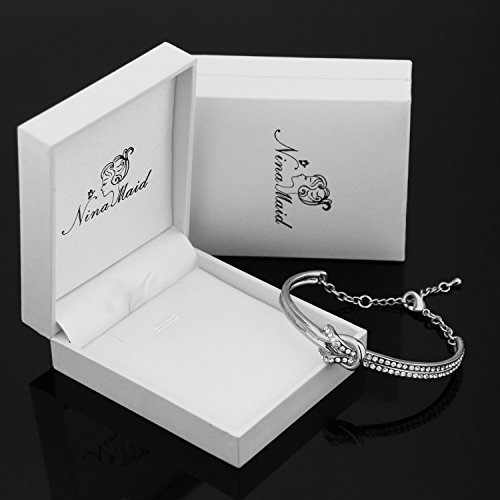 -. Feature : ★Swarovski Crystals★ Made with Swarovski Crystals this enchanting bangle bracelet oozes elegance, originality and style. Hand set Swarovski crystals contrast beautifully with the highly polished central section to create a bangle of exquisite proportions and style. Crystals are supplied by Swarovski but used by our own designers and manufactured in our own factory. This jewelry belongs to NinaMaid, not Swarovski. / ★Specifications and Materials★ This kind of bangle is oval-shaped. Inner circumference: 7 inch. Approximate size: 2.4 inch / 2 inch. Size can be adjusted by an extended chain. The extended chain is approximately 1.2 inch. Metal: Gold plated, eco-friendly zinc alloy, lead-free and nickel-free. No harm to health. Among the biggest benefits of gold-plated items is the fact that it is fairly strong. Gold-plating can lend an attractive finish to a piece that must be sturdy and durable. / ★Great Gift Ideas★ Each bracelet will be put into a lovely white jewelry box. It can be worn as a daytime accessory or a night-time statement piece and add sparkling shine to any occasion. If your purchase is to be a gift to someone - you're all set. It's an ideal gift for Birthday, Anniversary, Valentine's Day, Mother's Day, Thanksgiving Day, Christmas, etc. It is absolutely a best gift for you to express your love to your loved one. / ★Refunds and Exchanges★ Quality assurance and 60 days full refund guarantee. We not only pay attention to the quality of the products, but also the customer service. As a reliable seller on Amazon, our policy is make customers 100% satisfaction with our products and service. If you are unhappy with your purchase within 60 days for any reason, we would like to offer you a full refund or exchange within this period. / ★Unique Design★ The highlight of bangle is the combo design. This combo design means that I will always be with you unless you leave. This exquisite gold-plated bangle is delicate, romantic, and very feminine. It adds a touch of sparkling sophistication to any outfit. Featuring a knot motif, one half is embellished with crystals. Wearing on the wrist can make you not only elegant chic, add a bit pretty, a bit more self-confidence. But beyond that, the adjustable closure ensures a secure fit.