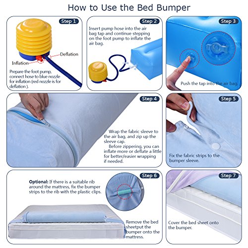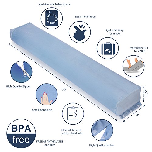Studio : Vbestlife Publisher : Vbestlife Binding : Baby Product Product Description Product description Looking for a safer, simpler, convenient Bed Rail Bumper? The Vbestlife sleep bumper is the ideal alternative. Make sure your loved one sleeps comfortably tonight and every night with the Vbestlife Bed Rail Bumper. -The Perfect Design: We have made our inflatable bed bumper steeper to ensure that active toddlers and children cannot easily roll out of bed.Made with premium quality non-toxic material and covered with a soft cover, this bed rail provides your toddler with a safe night sleep and a clear conscience for you. -Eesy to Install: The Bed Rail Bumper can be set up in seconds. Unwrap your Bed Rail Bumper and allow it inflate to full size. Place your Bed Rail Bumper directly on the mattress or mattress pad. Cover with a fitted sheet and the Bed Rail Bumper is ready to use! -lightweight and Convenient for Travel: Vbestlife comes with its own handy carry bag. Bed Buddy is so lightweight and rolls up easily into its bag for storage or travel. Fits any size bed including traditional Twin, Full, as well as cots and other travel beds you may find in Camping, Cruise ships or trains. -Interaction With Your Child: Our guardrail is convenient for multiple reasons. Parents can sit on the guard rail while reading a story to their children - which is cumbersome with most bed railing products. Product Specifications: Color: Blue Size: 56x9x4.5(in) Avoid Expensive and Inconvenient Bed Rails Not only are bed rails expensive, they are incredibly heavy and hard to store. The Vbestlife bed rail takes only a couple minutes to install and won¡?t hurt your body during setup. Once your child outgrows the bed rail, simply take it out, roll it up and store it in a closet. You can even roll it up to take on trips.