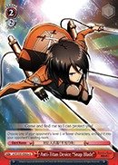 -. Binding : Toy -. Brand : Weiss Schwarz -. Edition : Attack on Titan Booster Pack -. Feature : A single individual card from the Weiss Schwarz trading and collectible card game (TCG/CCG). / This is of U rarity. / From the Attack on Titan Booster Pack set. -. IsAdultProduct : 0 -. ItemPartNumber : AOT/S35-E082a -. Label : Bushiroad Inc. -. Manufacturer : Bushiroad Inc. -. ProductGroup : Toy -. ProductTypeName : TOYS_AND_GAMES -. Publisher : Bushiroad Inc. -. Studio : Bushiroad Inc. -. Title : Weiss Schwarz - Anti-Titan Device "Snap Blade" - AOT/S35-E082a - U (AOT/S35-E082a) - Attack on Titan Booster Pack