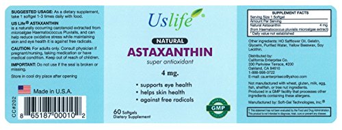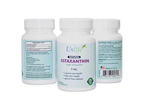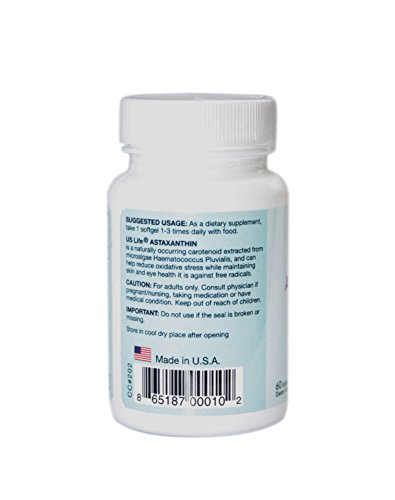 Us Life® Astaxanthin is a natural carotenoid that is extracted from microalgae (Haematococcus Pluvialis). Research suggests that Astaxanthin's powerful anti-oxidative properties provide a variety of health benefits such as reducing inflammation and skin damage when exposed to ultraviolet rays, promoting eye health to reduce eye strain and prevent Macular Degeneration, improving muscle recovery and endurance from physical exercise, supporting joint and tendon health to reduce inflammation and pain symptoms of Rheumatoid Arthritis and Carpel Tunnel Syndrome, and improving the overall health to the immune system. As an antioxidant, Astaxanthin is 6000 times stronger than Vitamin C, 800 times stronger than CoQ10, 550 times stronger than Vitamin E, and 11 times stronger than Beta-carotene. Us Life® Astaxanthin contains no artificial colors or flavors, no preservatives, and is made in the USA.