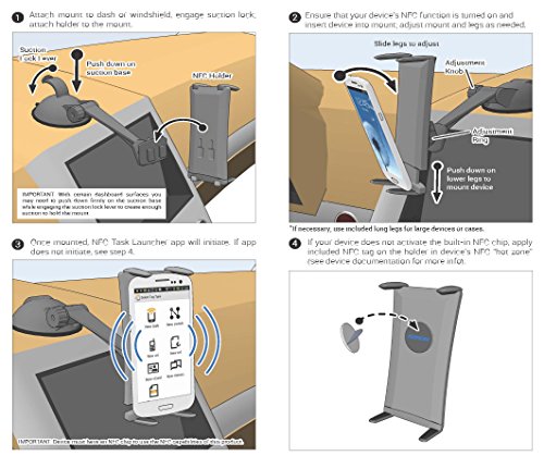 -. Feature : Holder fits NFC enabled smartphones and midsize tablets up to 7.5 inches tall / Launches your favorite apps and settings based on your preferences / Sticky suction mount provides a strong surface bond on smooth surfaces / 2 year limited warranty