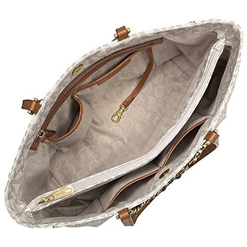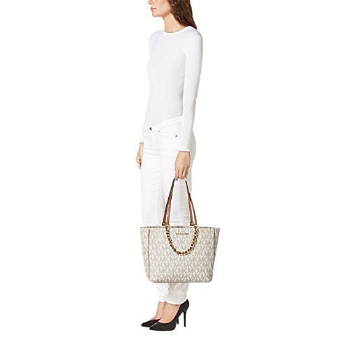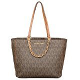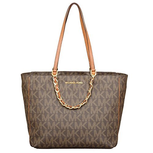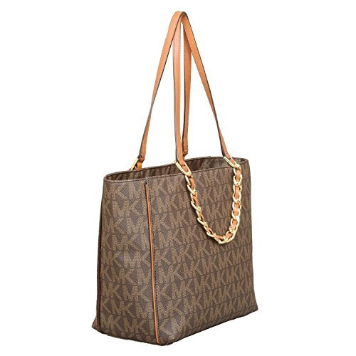 -. Feature : Made of MK Signature PVC, Brown leather trim and Gold hardware / Gold chains with interwoven leather hang off front and back, Chain handles 5.5" drop, Leather straps 10" drop / Double flat leather handles - Magnetic snap closure / Five interior pockets, key leash, and padded center zip pocket for iPad or tablet / Measures approx 16" W x 11" H x 5.5" D
