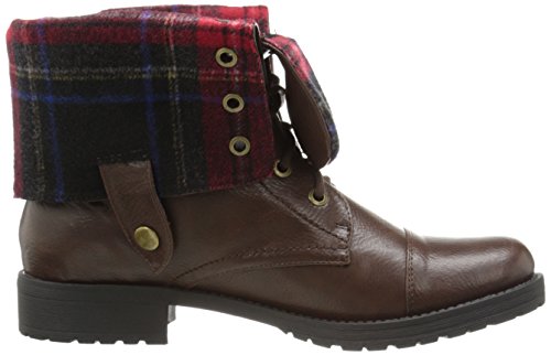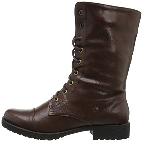 Folding cuff combat boot with warm contrast lining and brassy snap tabs