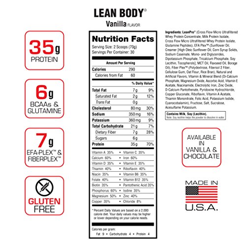 Lining your cupboards with superior protein is easier than ever with Lean Body in a Jug. Each serving floods your system with 35 grams of highly bioavailable proteins to nourish muscles and promote increased size and strength. The LeanPro blend is a proprietary mix of fast-release and slow-release proteins, to give you a sustained flow of vital amino acids that will support better workouts and more noticeable gains. Added to the Lean Body protein mix is 21 essential vitamins and minerals, essential fatty acids, and only six grams of sugar. You also get seven grams of fiber for healthy digestion, glutamine to help avoid muscle breakdown, and other powerful ingredients. All this in a formula that's free of maltodextrin, artificial colors, preservatives, or Trans fat.Feature