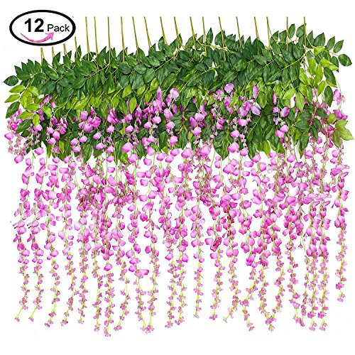 ESPOUS 12 Piece 3.6 Feet Artificial Flower Fake Wisteria Vine Rattan, Hanging Silk Flowers String for Home Party, Wedding Décor (Red Purple)