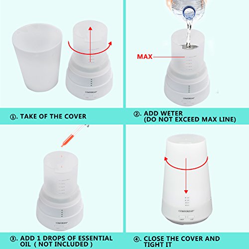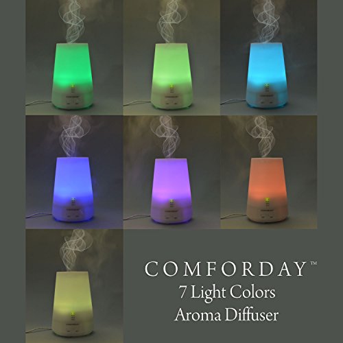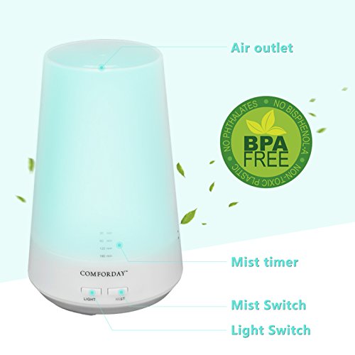 ★SAFE TECHNOLOGY: Comforday Ultrasonic 100ml cool Aroma Essential Oil Mist Humidifier is safe and does not harm the essential oils. It is equipped with 7 different LED colors and 4 timer settings to choose from. BPA free.