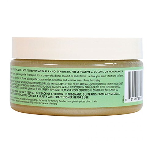This is a scrub like no other! Organic, Fair Trade CertifiedTM sugar cane granules lift away dull skin as creamy shea butter, coconut oil and vitamin E restore your skin's vitality and radiance. The warming and replenishing aromas of ginger and mint add the pleasure of aromatherapy to your experience.Feature