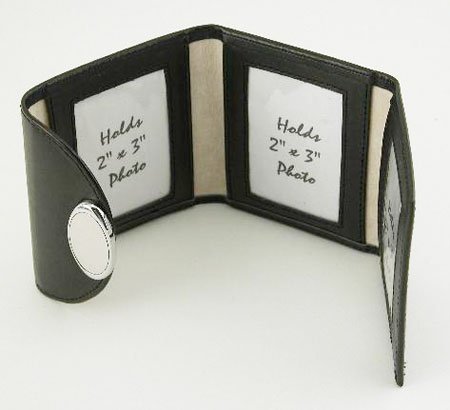 BLACK LEATHERETTE TRI-FOLD PICTURE FRAME, HOLDS 3, 2" X 3" PHOTOS.