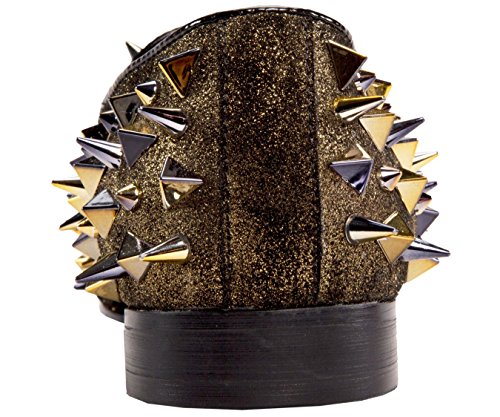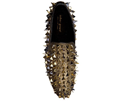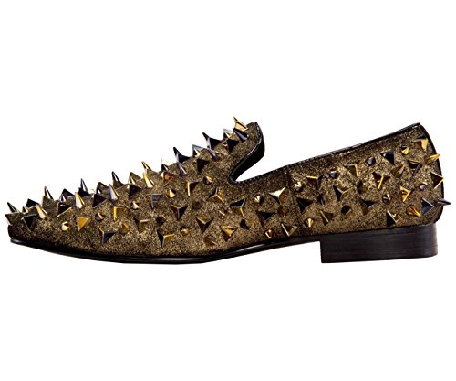 Binding : Apparel Product Description All eyes on you: These spike and pyramid studded genuine glitter sprayed suede tuxedo smoking slippers are the ultimate statement-making dress shoe. Whether it's for the holidays, a special occasion such as prom, or simply for a night out, these eye-catching shoes are essential for elevating your entire outfit. The classic smoking slipper silhouette is completely covered in glitter with matching metallic metal studs, giving this slip-on an eye-catching designer look. A low block heel and leather lining make these loafers comfortable to wear and easy to slip on. Take your look to the next level and add some major star power to your next night out on the town with these luxurious shoes. 0