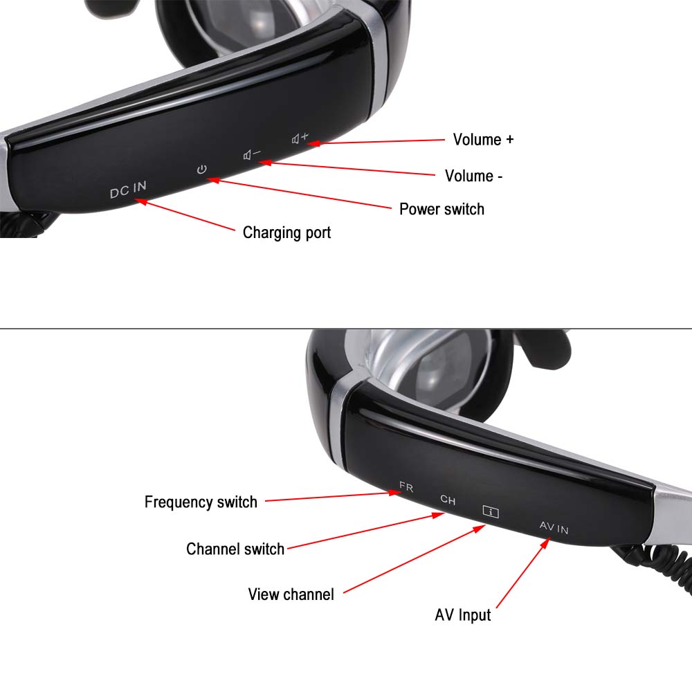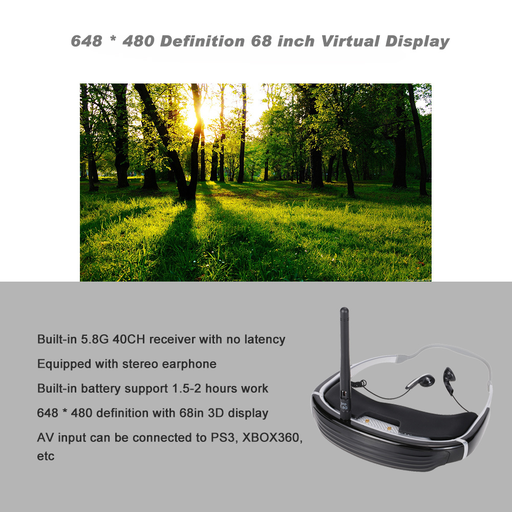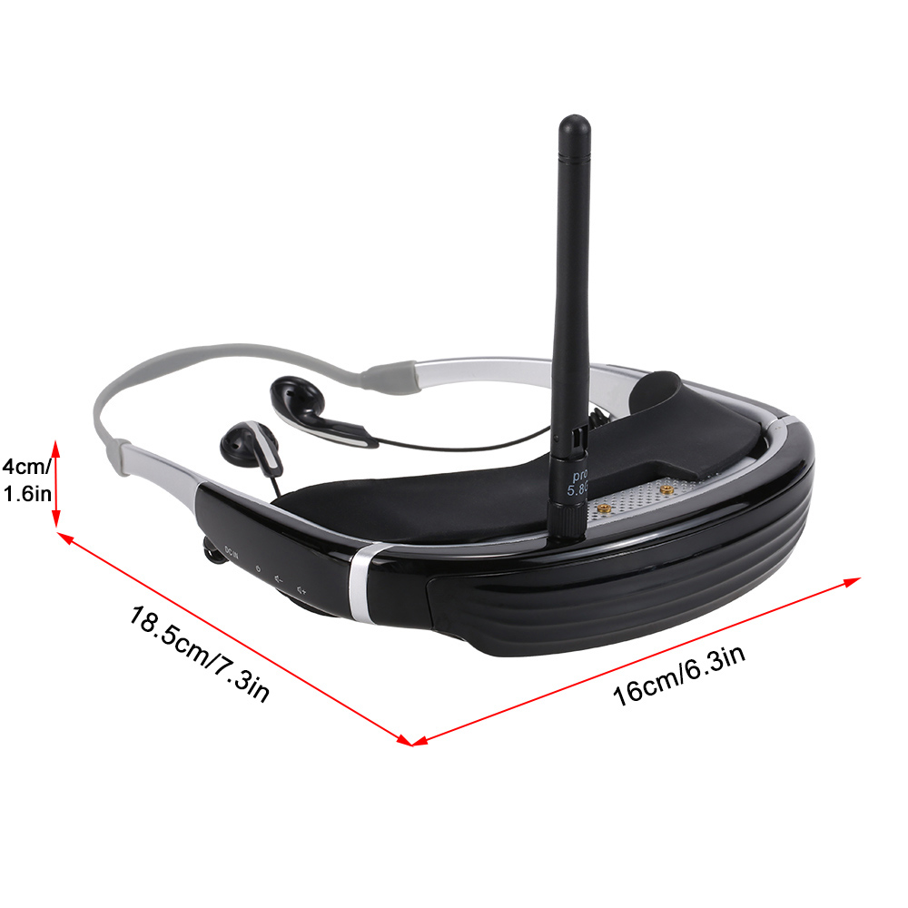 This high quality 5.8G FPV Goggles is with a 648 * 480 screen, provides sharp image and a 6 Inch large screen virtual experience. Equipped with eye patch and a rubber ring make it more comfortable to use. It's built-in 5.8G receiver supports 40CH and earphone for exciting racing sound. This is a must have product for FPV drone.