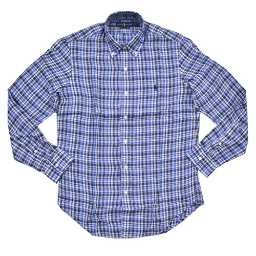 Polo Ralph Lauren Men's Linen Ocean Wash Plaid Long Sleeve Sport Shirt, Navy Blue / White (Medium)