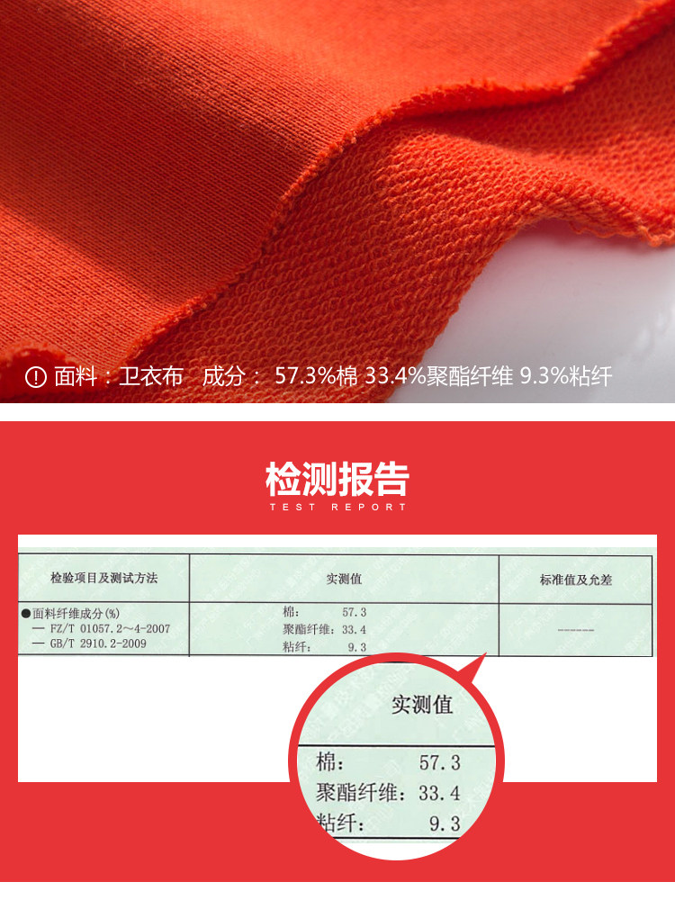 | 主 料:57.3%棉 33.4%聚酯纤维 9.3%粘纤颜 色:黑色,橘红 |