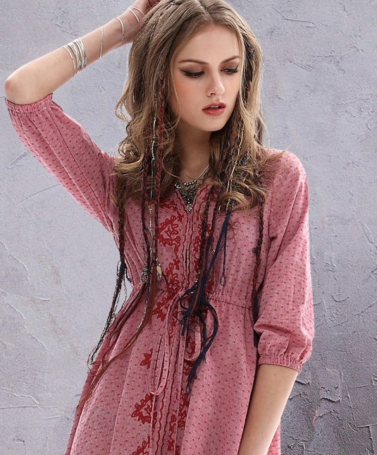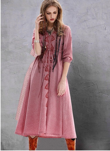 #エスニック#フェミニン#ワンピ#5分袖#ピンク#Vネック