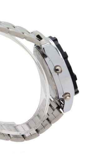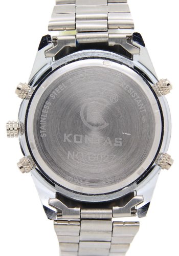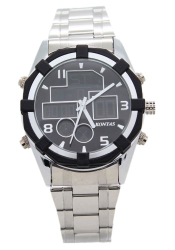 Studio : KONTAS Publisher : KONTAS Binding : Watch Product Description Specification: Goods Nameplate: KONTAS Case: Alloy Movement: ElectronicQuartz Bracelet / Strap: Stainless steel Diameter of case: 43 (mm) Diameter of dial: 32(mm) Width of band: 18 (mm) Thickness of case: 15 (mm) Color: Black Movement model: SEIKO quartz movement Weight: 0.132 (Kg) Function: 1. Fashion and sport design with fashionable bezel. 2. Electro-luminescent Backlight in darkness LCD display hour minute second month week and AM/PM. 3. 12/24 hours dual time display mode. 4. Stopwatch function. 5. Functional alarm setup and hourly reminder. 6. Water resistant. 7. Quality plastic watch strap. 8. Kinds of colors to choice. Manual: Under clock mode as the above figure press L key EL backlighting for 3 seconds. Press S key date is on. Press R key to show the alarm time. A. Setting of seconds counting: under clock mode press M key to start seconds counting mode; Press S key to count press S key to suspend repress S key to continue the counting from the above reader press S key to stop press R key to clear to zero return to the seconds counting mode(0:00 00) Sectional timing. Press S key to start press R key to read seconds counting of first section (continuing); repress R key to read the second section. A number of sections are available. B. Setting of alarm: under clock mode press M key twice hours flashing press S key to set the hour; press R key minutes flashing repress S key to set the minute; repress M key to return to clock mode. Hold R key on and press S key to turn alarm on/off (the alarm signal shows the alarm is set otherwise the alarm is off) . C. Setting of clock timing 0