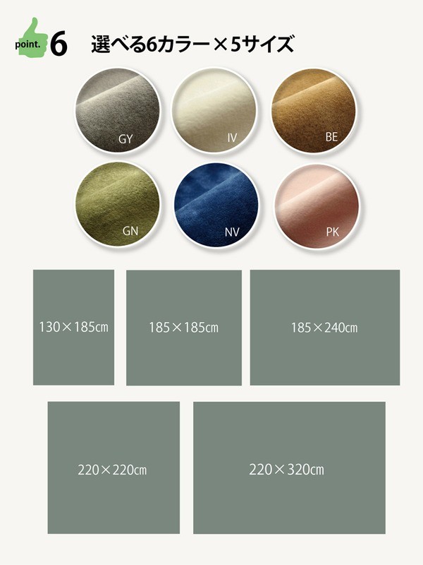 いままでのラグのご不満を解消すべくつくった、使いやすさにこだわったラグです。多色展開ですのでお部屋に合わせてお好きな色をお選び下さい。ラグの不満を解消できる10個のポイント(1)ソフトな肌触り。表地には短毛のマイクロファイバー(超極細繊維)を使用していますので、ソフトな肌触りです。(2)ヘタリにくい。目付は1平方メートルあたり240gで、密度が高くヘタリにくい仕様です。(3)オールシーズン使える。ホットカーペット、床暖房対応です。保温性もあり、サラリとしていますので、べとつかず暑い時期にもご使用頂けます。(4)ホコリが取れやすい。毛足が短いので掃除機もかけやすく、毛足にゴミが絡みにくい。マクロファーバーは遊び毛がでにくいという特長も持っています。(5)つまづきにくい。厚み約4~5mmで段差が少ないのでお子様やお年寄りにも安心です。(6)すべりにくい。普段見えない裏部分にもこだわりました。フローリングを傷つけにくいよう裏には不織布を貼っています。また、すべりにくい加工を施していますので、部屋を走り回るのが大好きなお子様やペットがいるご家庭にも安心てご使用頂けます。(7)軽量で持ち運び楽々。(8)洗濯機で洗える(洗濯ネット使用)。ご家庭の洗濯機で洗えるウォッシャブル仕様です。軽量なので干しやすく、乾きも早い。(9)インテリア性へのこだわり。ヘリ部分はヘムをまかずにオーバーロック加工で仕上げました。お部屋に敷いて頂いた際の見た目にもこだわりました。(10)コンパクト収納。薄手なので小さく折りたたむことができます。収納時にも場所をとりません。