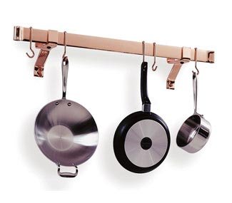 Either a hanging pot rack or a wall mounted pot rack depending on your taste and space; use Enclume wall brackets for the wall or Enclume captain hooks for the ceiling