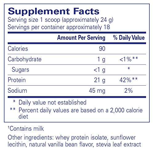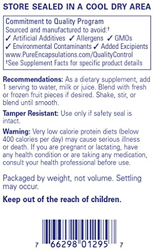 DOSAGE: Pure Encapsulations recommends to mix 1 serving with water, milk or juice. Blend with fresh or frozen fruit pieces if desired. Shake, stir, or blend until smooth. Serving Size: 24 Grams (1 scoop). Servings Per Container: 18. WARNING: Very low calorie protein diets (below 400 calories per day) may cause serious illness or death. Do not use for weight reduction in such diets without medical supervision. This product contains milk.