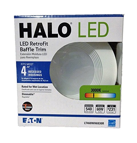 The Halo LT4 combines the energy savings, long life and sustainability of LED in an easy to install retrofit baffle trim kit. Friction blades hold the trim tight to ceiling; use in new construction, remodeler and retrofit installation in Halo and other compatible 4 In. Recessed housings. The diffuse lens provides shielding to the source and wet location listing; suitable for use in Showers or in outdoor covered ceiling applications. Also conforms with NFPA requirements for closet use. Integral driver provides 120-Volt phase cut dimming, an inline connector provides power using a medium base socket Adapter provided or connect directly to the mating connector in the LED housings. Ships with a gasket and makes any housing airtight for added energy savings and code compliance.Feature