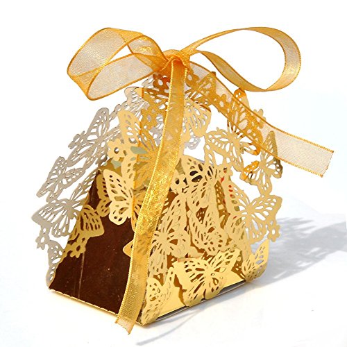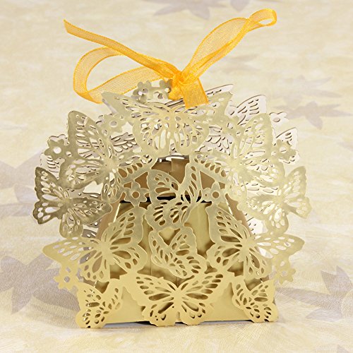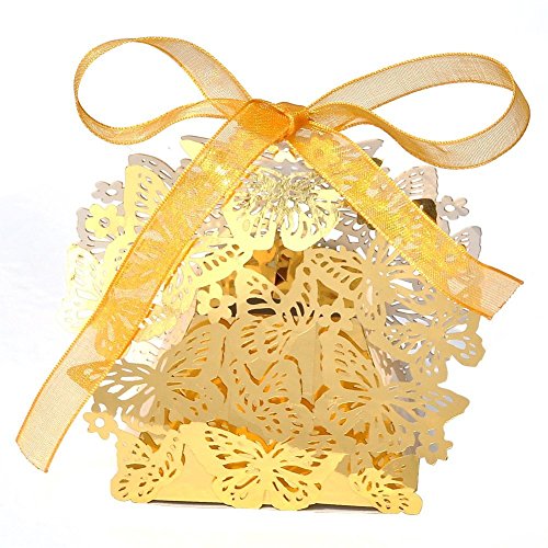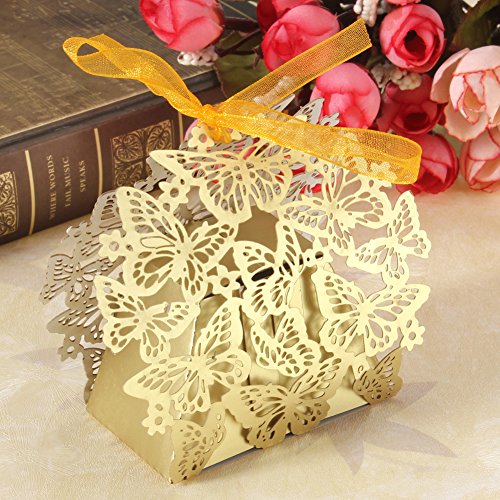 50 PCS Laser Cut Wedding Boxes, Butterfly Gold Favor Boxes with Ribbon for Birthday Party Baby Shower-Gold