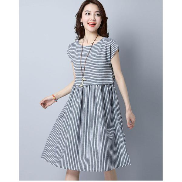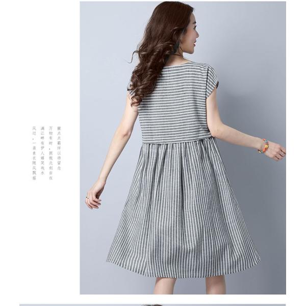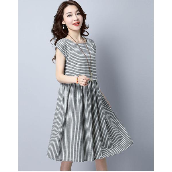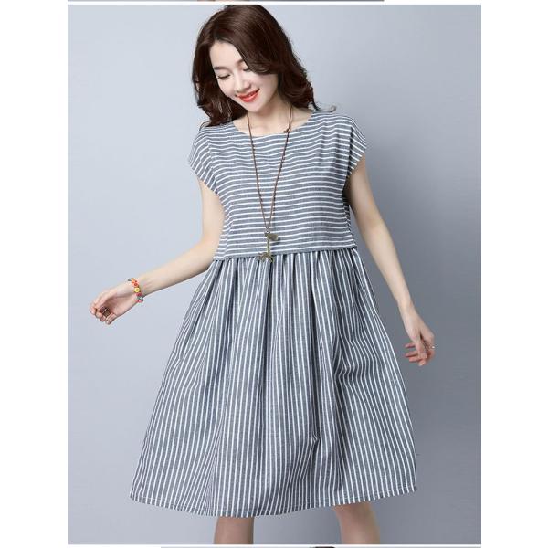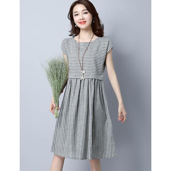 ストライプ柄のワンピース。綿麻素材なので清涼感溢れる着心地。