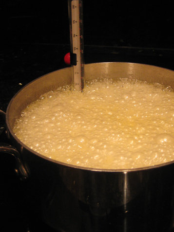 [温度 160℃]此为糖之融解点。沸滚中的糖浆呈金黄色,浸入水中马上凝结成片状脆糖,无法成团。