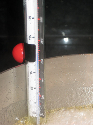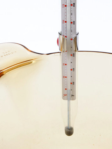 建议将温度计卡在锅具对边,刻度朝向自己,方便读数。