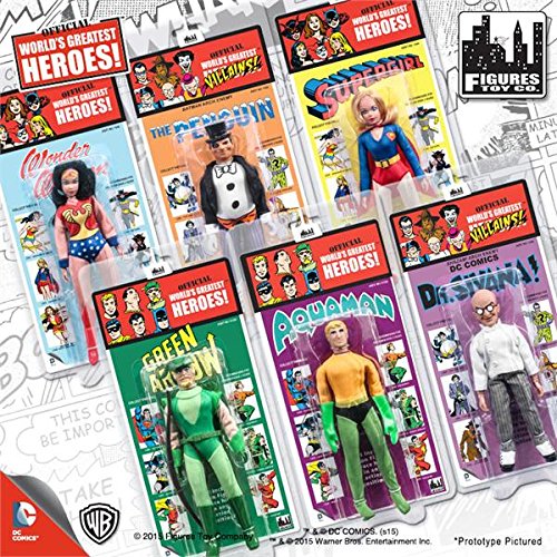 -. Feature : DC Comics Retro Kresge Style Action Figures Series 2: Complete Set of all 6 / SUPER GIRL, WONDER WOMAN , DR,SIVANA , THE PENGUIN, / AQUAMAN and GREEN ARROW