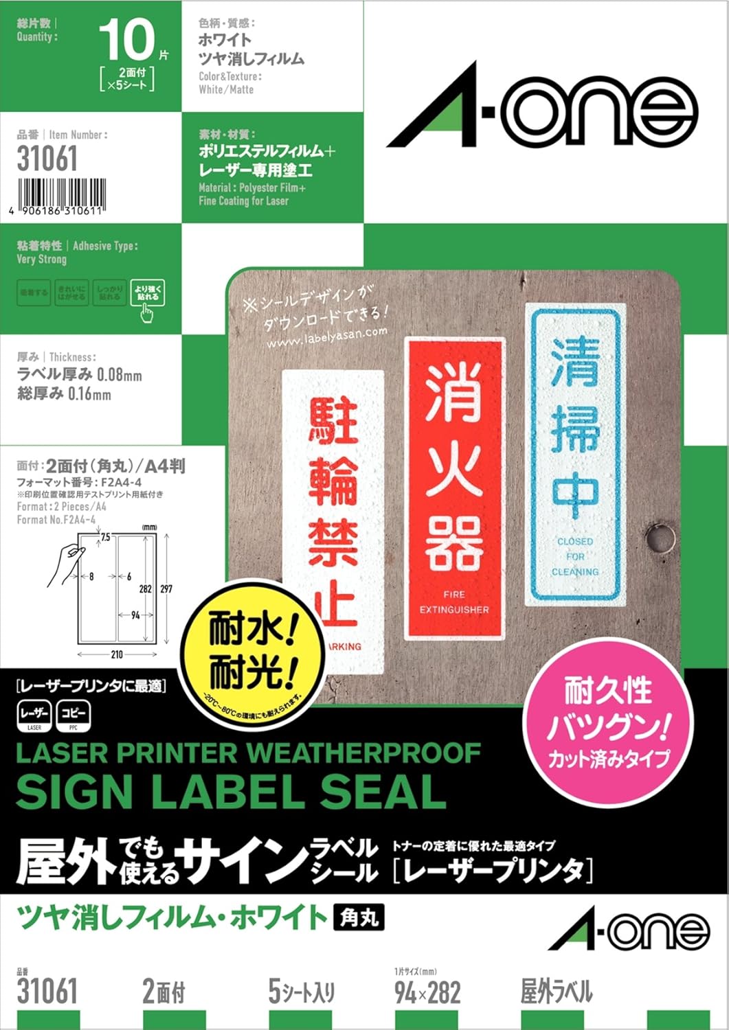 ツヤ消しフィルム・ホワイト/材質:ポリエステルフィルム/標準総厚み:0,16mm/ラベル厚み:0.084mm A4 2面(2列×1段)/シートサイズ:A4判(210mm×297mm)/ラベルサイズ:94mm×282mm(2列×1段) 対応プリンタ: レーザー コピー