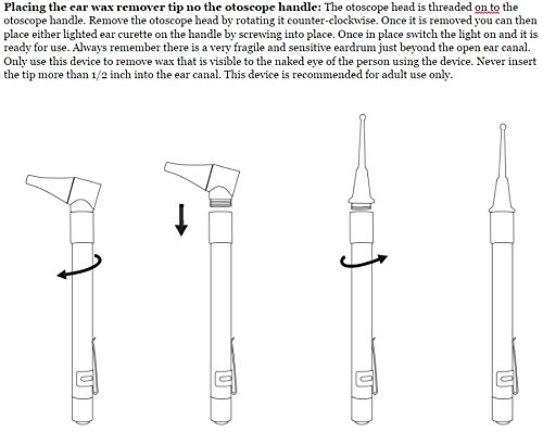 ** Otoscope is for use in ALL ages but the Ear CURETTES are for ADULT use only *** PLEASE read the directions before use. The Lighted ear curettes do not attach to the otoscope head but to the otoscope handle.