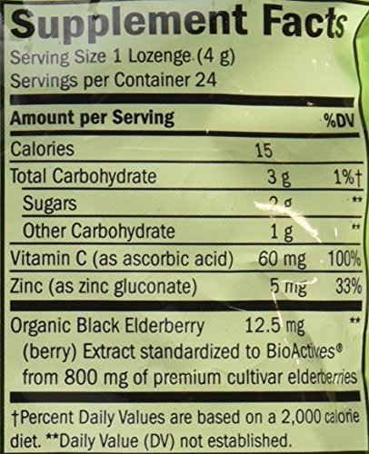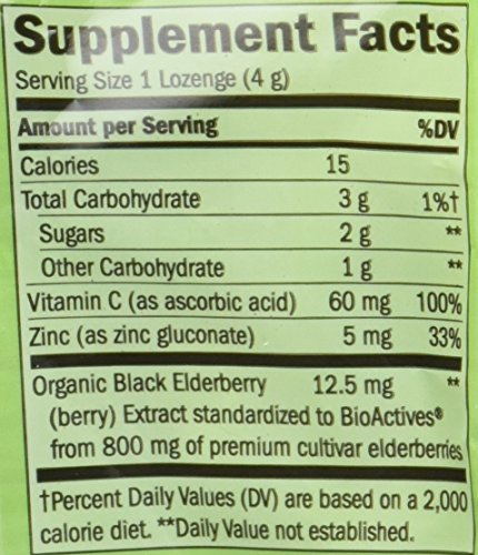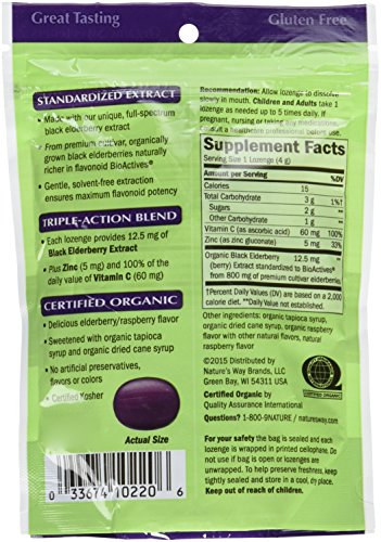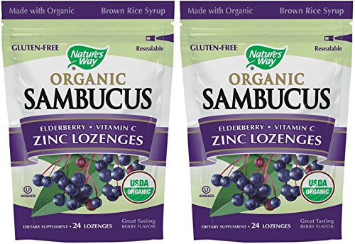 -. Binding : Health and Beauty -. Brand : Nature's Way -. Feature : 2 Bags of 24 Lozenges / Made with organic brown rice syrup / Gluten free / Elderberry -. Label : Nature's Way -. Manufacturer : Nature's Way -. PackageQuantity : 1 -. ProductGroup : Health and Beauty -. ProductTypeName : HEALTH_PERSONAL_CARE -. Publisher : Nature's Way -. Studio : Nature's Way -. Title : Nature's Way Organic Lozenge, Elderberr Zinc, 24 Count