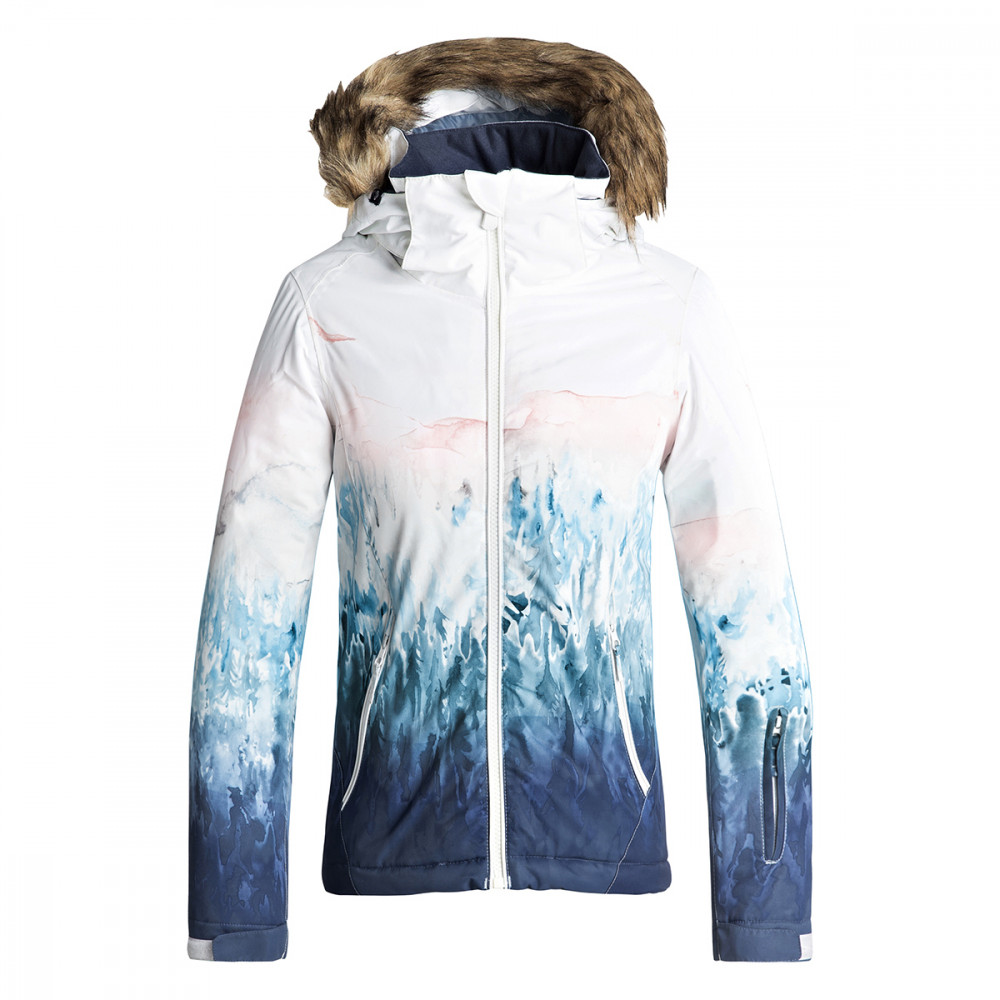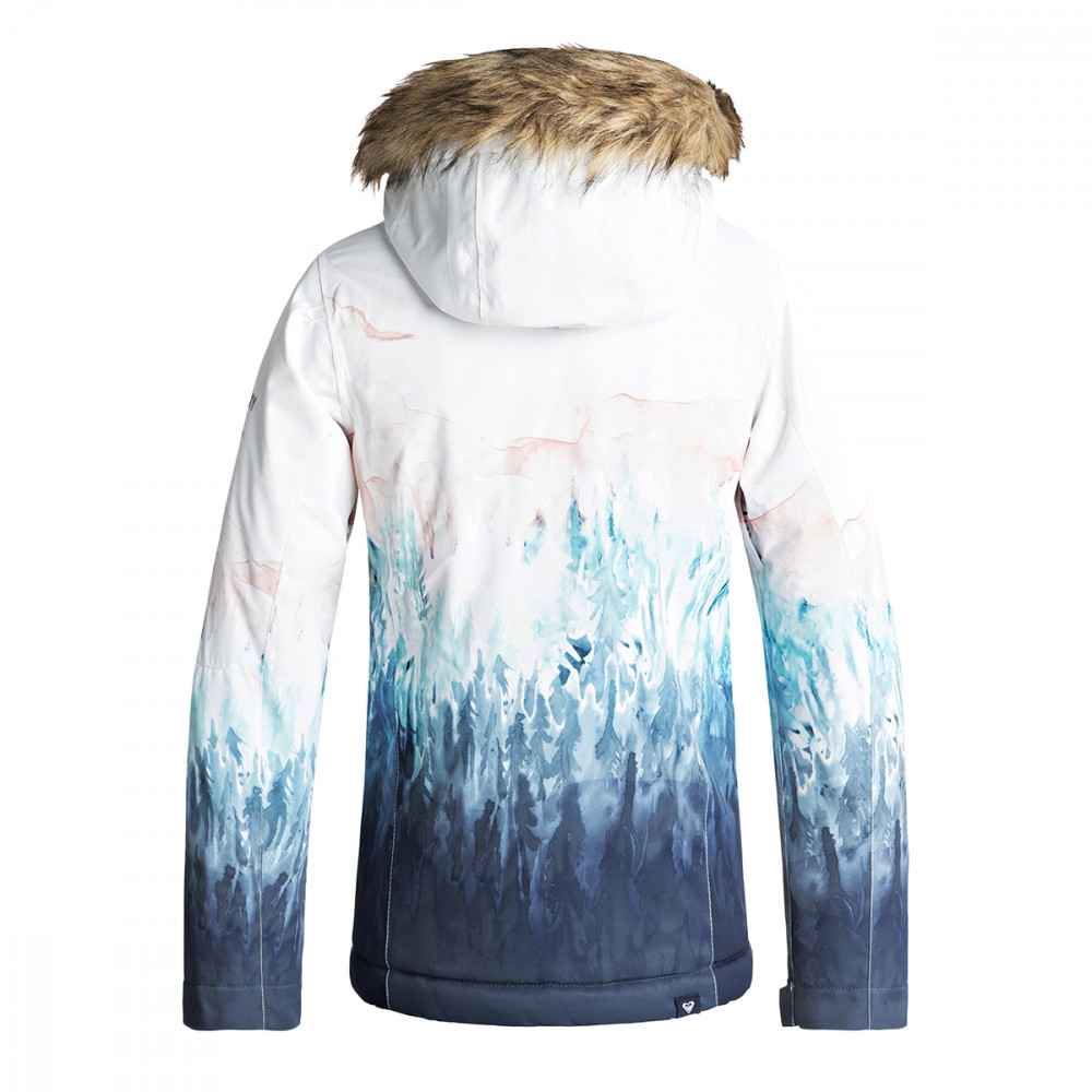 아동용 스노우 재킷. 10K 방수기능 소재 겉감과 ROXY WarmFlight® 충전재로 우수한 보온 유지와 내구성, 방수성을 제공한다. Slim fit(슬림 핏). 방풍을 위해 솔기 일부가 테이프처리 되었다. 후드와 인조 퍼 트리밍은 탈부착이 가능하며, 게이터가 있어 헬멧 착용시 고정할 수 있다. 버튼으로 탈착하는 파우더 스커트가 부착되어 자켓과 바지를 연결해주는 구조이다. 그 외 제품 구조: 턱 가리개, 고글 수납용 내부 포켓, 라이크라 소재 손목 게이터, 겨드랑이 메쉬 통풍구, 소매에 티켓 포켓. | |