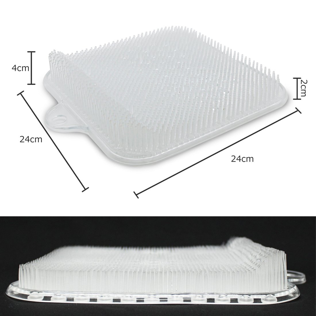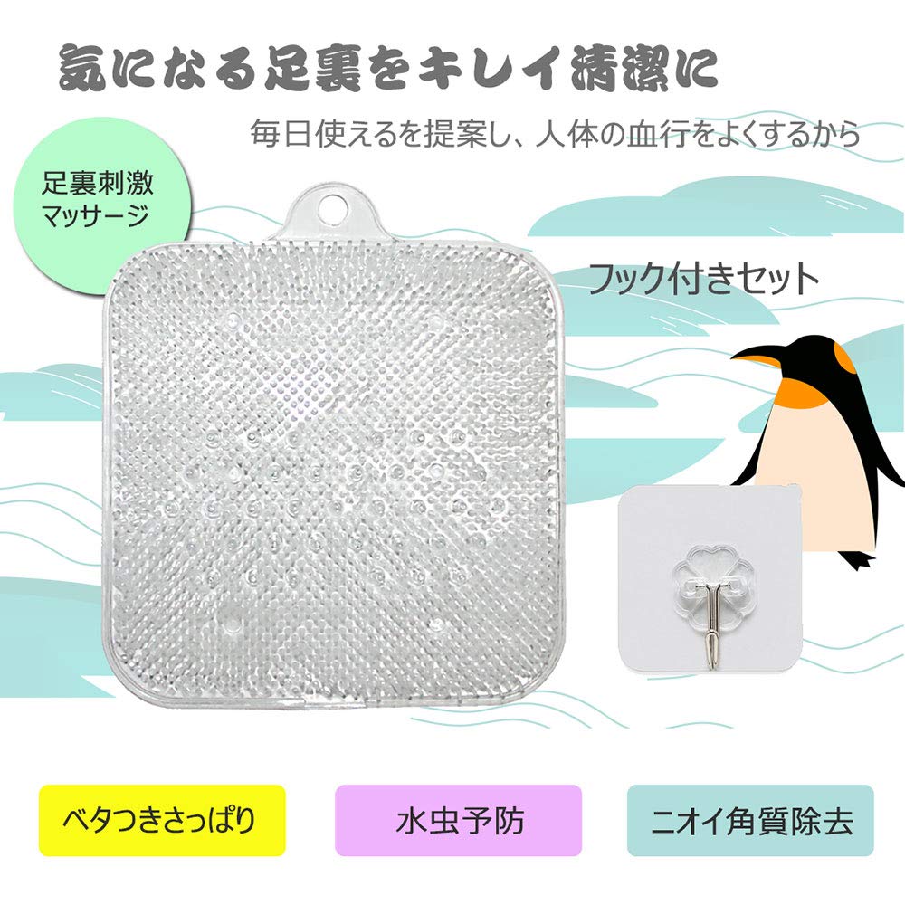 セット内容:足洗マット+壁掛けフック。 本体重量:0.3KG 。材質:ポリ塩化ビニル(PVC) 。寸法:24x24x4cm【使いやすいサイズで、女性なら幅広の足サイズの方でも両足を揃えて洗える。】
