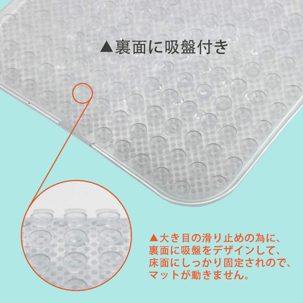 足洗いマットの前端に長いブラシ設計、石鹸かボディソープで泡立てながら前後にこすると足指のすき間までスッキリ。裏面に165個の真空吸盤があって、床面にしっかり固定されて、マットが動きません。掛けできる設計、使用後はフックに掛けで収納、衛生的で便利です。