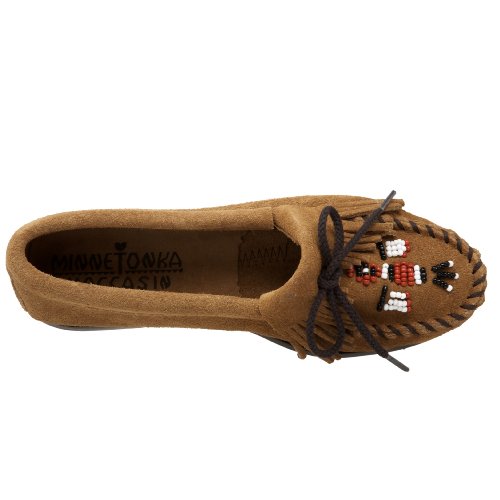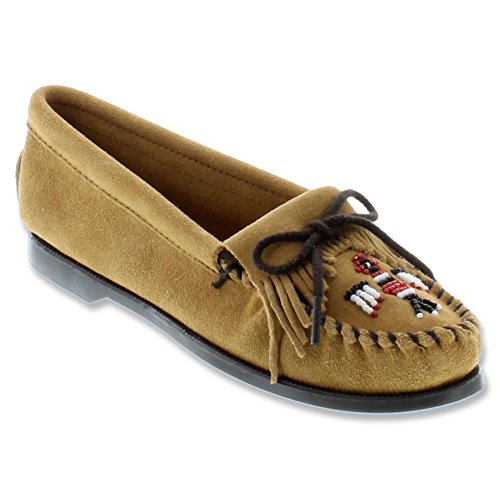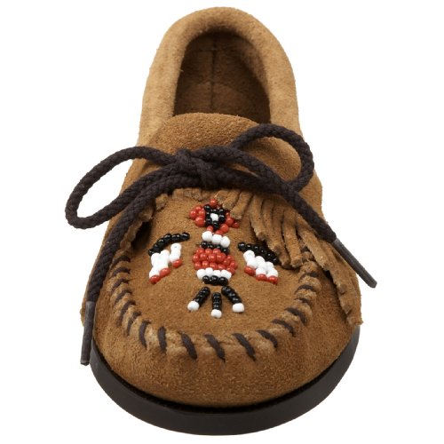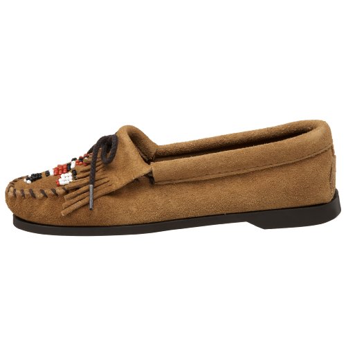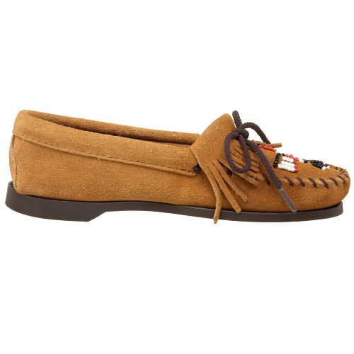With easy slip-on styling and a boat sole that transitions indoors to out, there's a lot to like about this Minnetonka moccasin Cord whipstitching and an attached, graduated kiltie. Round toe.Feature