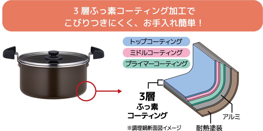 3層ふっ素コーティング加工。こびりつきにくく、お手入れ簡単