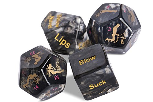 Product DescriptionINCLUSIONS: 6-sided dice (x1) - Stroke, Kiss, Lick, Blow, Suck, You Choose! 10-sided dice (x1) - Toes, Nipples, XXX, Ass, Fingers, Neck, Inner Thigh, Below Navel, Lips, Ears 12-sided dice (x2) - 24 different positions!0