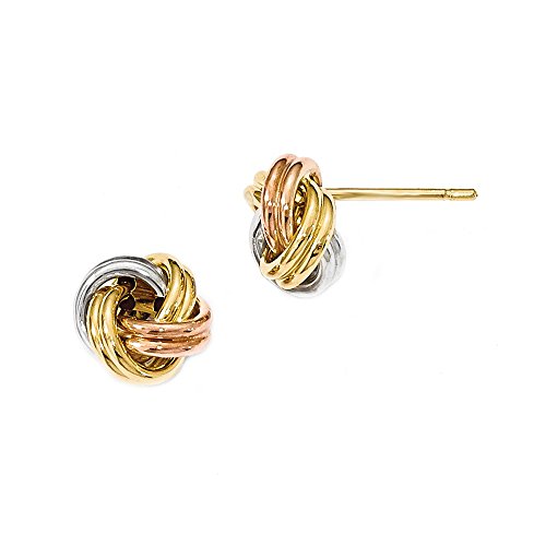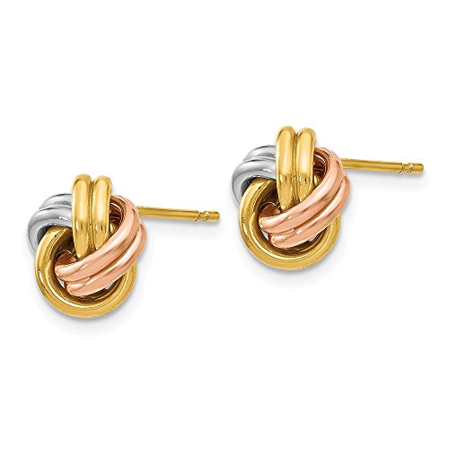 The well-shaped 14k gold tri-color Love Knots are woven from strong pairs of polished gold tubes