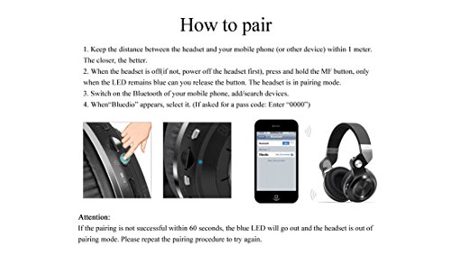 Feature : Great sound from 57mm drivers: our engineers spend two years in creating the 57mm driver for Turbine series, to bring you amazing Bluedio sound without breaking your bank. / Cool look inspired from Turbine which we think can best represent your endless passion and energy. Also the earcups can rotarily fold up, easy to carry on the move. / Support FM broadcast / Micro SD card playback of MP3 and WAV audio formats *note: Micro SD card not provided / Up to 40 hours continuous music time from the latest Bluetooth 4.1 low-power technology / The Bluetooth perfectly works with your smartphone, tablet or Bluetooth enabled MP3 player. Note: there may be compatibility issue with other devices.