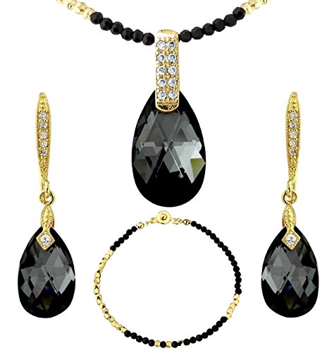 Beautiful tear drop theme black crystal pendant and earrings set made from swaroski CRYSTALLIZEDTM Elements range crystals with contrasting gold tone earring bails and gold tone pendant connector - with matching black and gold tone crystal bead bracelet. Immaculately finished with a black and gold touch crystal bead pendant chain. Beautifully designed by Crystal Elegance UK. Chain length 40cm approx. Beautiful and elegant tear drop earrings and pendant set. Earrings measure 3.5cm drop down x 1cm (crystal width) approx. Earrings held up by elegant gold tone crystal studded connectors.. Pendant measures 2.5cm (drop down) x 1.5cm (approx). Black and gold crystal bead chain measuring 40cm (2mm thick). Made using swarovski element crystals (for both pendant and earrings) and rhodium plating. . Very high quality item. For pierced earrings. Comes in a silver and black gift box with black velvet sponge lining.Feature