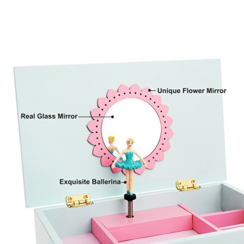 Studio : Songmics Publisher : Songmics Binding : Kitchen Product Description Are you looking for a sweet and lovely musical jewelry box to bring joy to your little girl's world? Then, you are in the right place! This SONGMICS adorable jewelry case has a sweet and fun appeal that will capture the imagination of her own spirit. The hinged lift lid opens to a delicate flower mirror that your little one can fill to her heart's content. She'll be captivated as she watches the twirling ballerina and listens to the cheerful melody of "Twinkle Twinkle Little Star". Just an easy turn of the winding key on the back of the jewelry box will keep the figurine and music going for as long as your girl wishes, perfect for a dancer. The assorted compartments and drawers allow for ample storage and lets her arrange her items as she pleases. Specifications: - Main Color: Blue - Material: Medium Density Fiberboard (MDF), Flocked Fabric, Hardware - Product Size: 7 3 /8"L x 4 1/2"W x 4 7/8"H (18.8 x 11.5 x 12.3 cm) - Product Weight: 1.29 lbs Package Contents: - 1x Musical Jewelry Box - 1 x Cleaning Cloth Notes: - Avoid direct exposure to the sun. - Avoid sharp, pointed objects like knives to prevent scratches. 0
