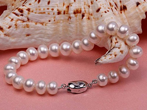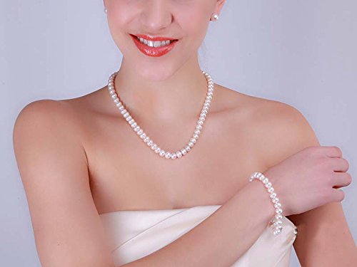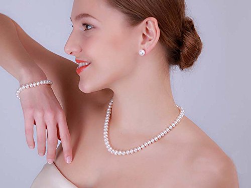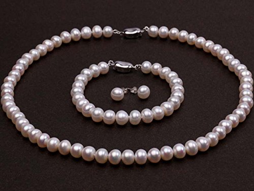 The studs of earrings are made of sterling silver. The necklace, bracelet and earrings set features lustrous, smooth and similar-sized pearls with slight blemishes.