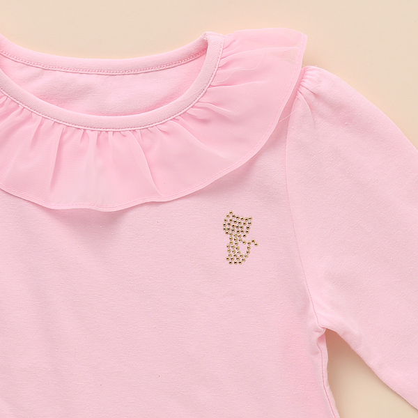 상품설명 귀여운 핑크 컬러에 매칭 쉬폰 프릴 디자인을 더해준 기본 TS 아이템 입니다. 목 부분에 매칭 쉬폰 프릴 장식을 더해주어 더욱 시원해 보이고 하늘하늘한 느낌이 더욱 사랑스러워 보입니다. 상단에 골드 고양이 핫피스 포인트로 고급스러움를 더해 주었습니다 . 심플하고 가볍게 데일리 룩으로 코디하기 좋은 컬러감 예쁜 TS입니다.