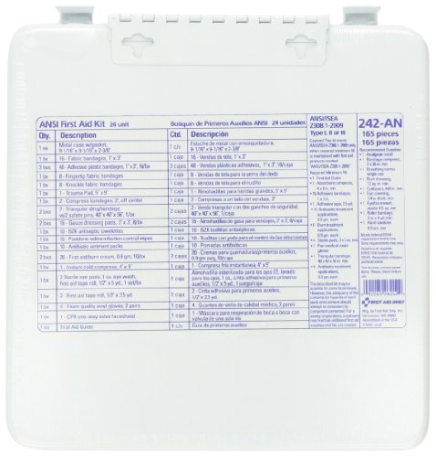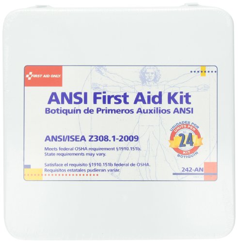 -. Binding : Health and Beauty -. Brand : First Aid Only -. EAN : 0092265262422 -. Feature : Great variety of first aid supplies that are easy to locate and use / Quality, hospital grade first aid supplies / Proudly made in the USA by American workers -. IsAdultProduct : 0 -. Label : First Aid Only -. Manufacturer : First Aid Only -. Model : 242AN -. MPN : 242AN -. NumberOfItems : 1 -. PackageQuantity : 1 -. PartNumber : 242AN -. ProductGroup : Health and Beauty -. ProductTypeName : HEALTH_PERSONAL_CARE -. PublicationDate : 2013-07-15 -. Publisher : First Aid Only -. ReleaseDate : 2015-06-22 -. Studio : First Aid Only -. Title : First Aid Only Unitized First Aid Kit Ansi-24 Unit Metal Case, 4.7 Pound -. UPC : 092265262422
