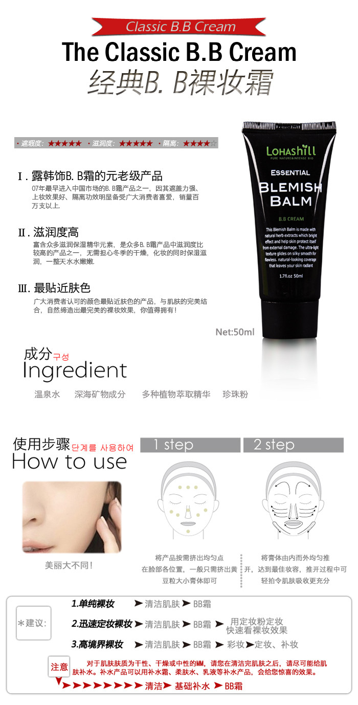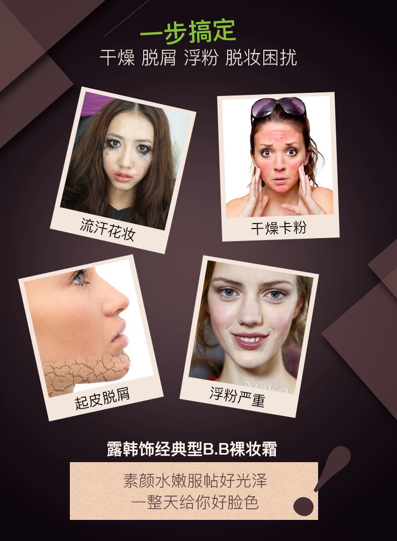 具有滋润肌肤、优化美白、淡化幼纹及干纹,有效修饰痘疤、遮盖斑点、黑眼圈、保湿补水等多种功效集于一身。可以迅速的令我们感受到全新一代韩国时尚的清新裸装