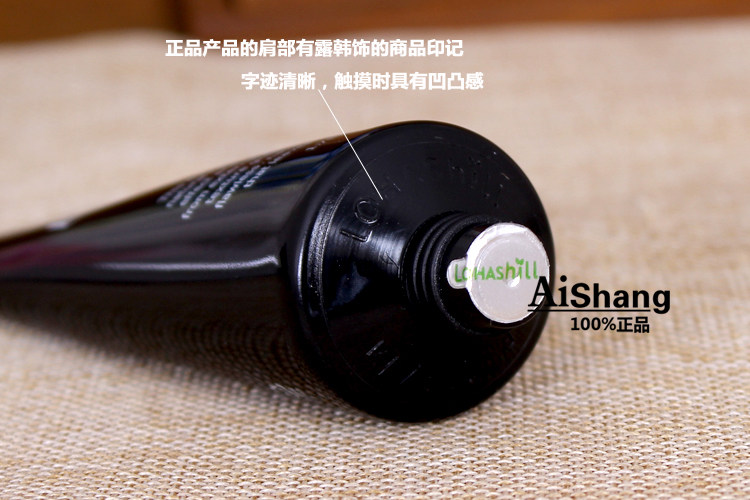 正品产品的肩部是有露韩饰的品牌印记的,而且印记的字迹清晰,触摸时具有强烈的凹凸感。而瓶口是用锡纸封口的,锡纸上面也印有露韩饰的商标字样