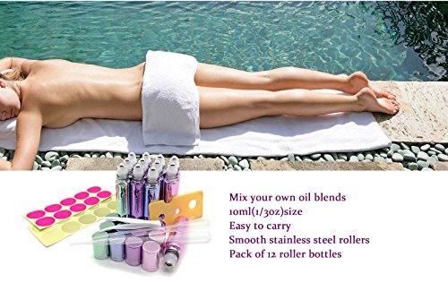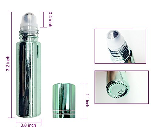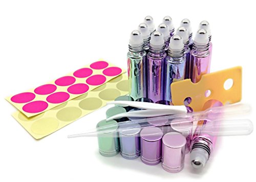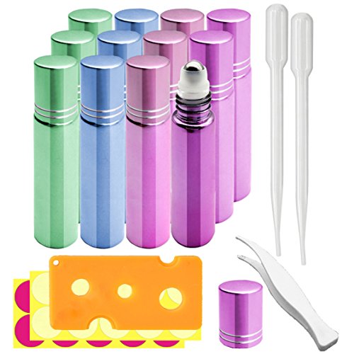 - 12, 10ml metal plating Glass Roller Bottles with stainless steel roller balls and metal plating caps for easy even oil application, no more rollers getting stuck or falling out. Each box contains 3 of each color: Pink, Green, Blue, and Purple