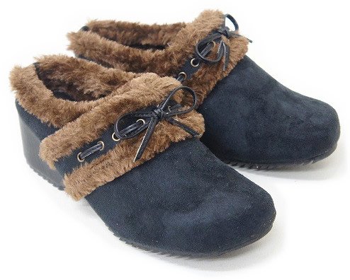 -. Feature : 履き口周りにボア ファー飾りの付いたサボサンダル / 風合いのあるスエード調素材 / 靴中はサラッとしたナイロン裏地 / 傾斜のあるウエッジソール / 滑りにくいアウトソール