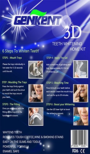 -. Binding : Misc. -. Brand : genkent -. EAN : 0010424109951 -. Feature : Bring you a bright smile : our kit includes everything you need for pearl white teeth at home / Affordable : no more expensive ,save thousands of dollars for you / Include: 44% Carbamide Peroxide Gel , White light, & thermoform trays / Meets USP standards & FDA compliant .Heat-molded trays fit perfectly to your mouth / Easy to use : form the trays to fit your teeth in a few minutes and just add gel for a simple and convenient smile make over. -. IsAdultProduct : 0 -. MPN : 0010424109951 -. PackageQuantity : 1 -. PartNumber : 0010424109951 -. ProductGroup : Beauty -. ProductTypeName : BEAUTY -. Title : Genkent Professional Teeth Whitening Kit 44% Carbamide Peroxide 6 Syringes Gel 2 Pcs. Thermoform Trays + 1 Pcs. Bonus White Light -. UPC : 010424109951