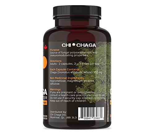 -. Feature : WHY CHOSE CHI CHAGA MUSHROOM SUPPLEMENT - Known as a superfood and for its immune boosting properties Chaga medicinal mushroom "Inonotus Obliquus" contains 215 Phytonutrients Including 29 polysaccharide or beta glucan derivatives. It provides high levels of superoxide dismutase and rates the highest on the ORAC scale of antioxidants. / A TRUSTED BRAND - Chi Chaga is Canadian global leader in Chaga mushroom products. Chi Chaga offers you the cleanest wildcrafted Chaga Mushroom available. We carefully pick it in P.R.Istine forests of Quebec from the birch tree while it's "alive" and without damaging it, thus allowing it to re-grow. Chi Chaga products are Health Canada approved #NPN 80078035 and packaged under under strict quality control and sanitary certification in a Health Canada and FDA / IMPROVE QUALITY OF LIFE - Each bottle provides 120 Vegetarian easy to swallow capsules (1 Month supply)